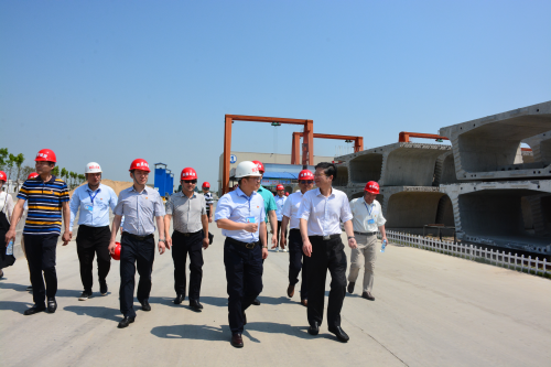上午10点,周智安一行来到我司梁场生产基地,首先对梁场整体建设进行了观摩,然后重点参观了基地钢筋车间及宣讲台等地,并与一线生产者们进行了亲切交谈。进入梁场后,周智安一行在钢筋车间门口简单驻足,观看了工业化公司预制梁生产技术宣传片,然后步行穿过了基地的两个钢筋生产车间,仔细观看了基地党员示范牌、“三风”宣传板、安全宣讲台等设施,详细听取了城建工业化公司关于“三风”活动开展和梁场生产情况的介绍,热情询问了公司在“三风”活动建设、“工匠精神”树立等情况。